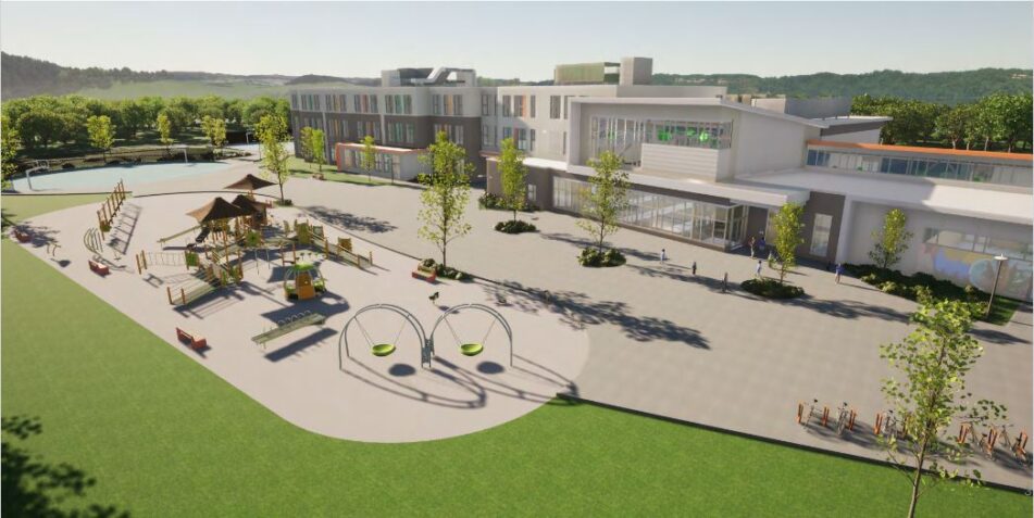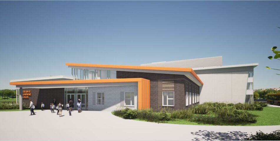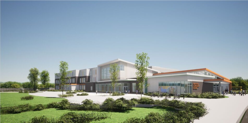 K-5 students in a new three story, steel frame,105,750 GSF Net Zero building. The